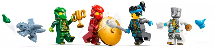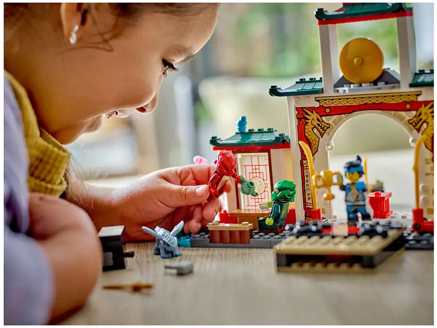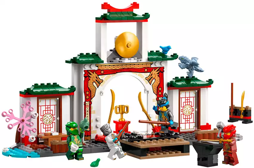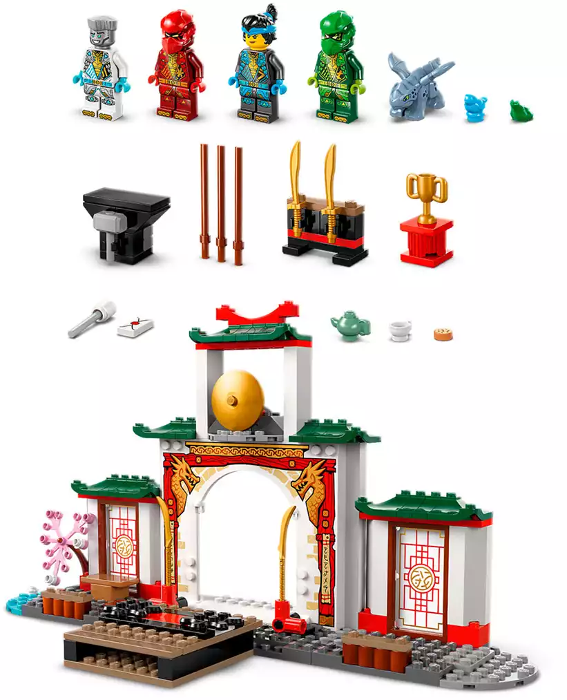 Конструктор Храм Ниндзя Спинжитсу (71831) основан на анимационном сериале «Восстание драконов-ниндзя» и позволяет детям от 4 лет и старше собрать Храм ниндзя. В нем есть несколько игровых зон: чайный домик, учебная часть для тренировок с вращающимися пластинами и небольшой сад. В набор входят четыре мини-фигурки персонажей: Зейн, Ния, Кай и Ллойд и дракончик Рио. Дети смогут придумать для них множество увлекательных занятий и опасный миссий, а также воспроизвести события из любимого мультфильма. Минифигурки можно разместить на 2 поворотных платформах для эпических сражений, а для дополнительной игры есть большой выбор аксессуаров: оружие ниндзя, в том числе 2 меча и 3 посоха, а также молоток, птица, лягушка, трофей, печенье и письмо. В комплект приключенческой игрушки входит стартовый кубик — частично собранная основа, которая позволяет детям быстро и уверенно конструировать.